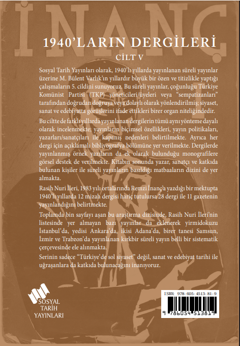Sosyal Tarih Yayınları olarak, 1940'lı yıllarda yayınlanan dergiler üzerine M. Bülent Varlık'ın yıllardır büyük bir özen ve titizlikle yaptığı çalışmaların 5. cildini sunuyoruz. Rasih Nuri İleri'ye göre 1940'lı yıllarda TKP üye ve sempatizanlarının yayımladığı dergi ve gazete sayısı (12 mizah dergisi dışında) 39 civarındadır.Toplamda 1000 sayfayı aşan bu araştırma dizisinde;İleri'nin listesinde yer almayan bazı yayınlar da eklenerek,29'u İstanbul'da,7'si Ankara'da,2'si Adana'da,1'er tanesi de Samsun,İzmir ve Trabzon'da yayımlanan 41 süreli yayın incelenmektedir.Bu dizinin ,Türkiye'de sol siyaset tarihiyle ilgilenenler dışında sanat ve edebiyat tarihi ile uğraşanlara da katkıda bulunacağına inanıyoruz.