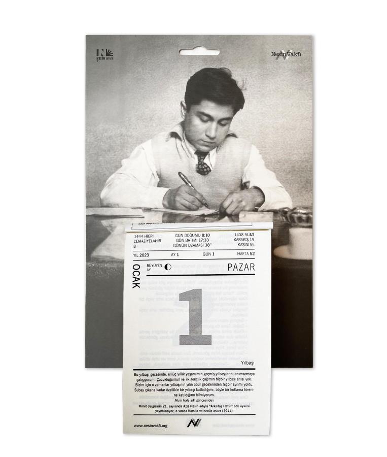 On bir yıldır yayımladığımız Nesin Vakfı Duvar Takvimi`ne gösterdiğiniz ilgiden ötürü teşekkür ederiz. Takvimimiz size ilk bakışta günü, haftayı, ayı hatırlatıp, ayrıca yılın kaçıncı günü, haftası ve ayında olduğunuzu gösterecek. Her yapraktan gün doğumu, gün batımı gibi diğer destekleyici zaman bilgilerini de öğrenebilecek, ayın hangi evrede olduğunu kolayca görebileceksiniz. Takvimde diğer takvim sistemlerine de yer verdik. Ay döngüsünü temel alan Hicri takvim öncelikle dini günleri göstermesi bakımından önemini sürdürüyor. Güneş döngüsünü temel alan Rumi takvim 13 günlük farkla şu an kullandığımız takvimle çakışıyor. Rumi takvimin zaten birkaçı hariç güncel takvimle aynı olan ay adları yerine, Anadolu`da kullanılagelmiş ama unutulmaya yüz tutan 12 aylık halk takvimi ay adlarını kullandık. Öte yandan yılı yaz (Hızır) ve kış (Kasım) olarak ikiye ayıran, yine güneş döngüsünü izleyen halk takvimi sistemini de takvim yapraklarına ekledik. Bu takvimlerin günleri meteorolojik olaylar ve tarımsal etkinliklerle yakından ilintili. Günü geldikçe resmî ve dini tatilleri, özel gün ve haftaları da takvim yapraklarında bulacaksınız. Tabii Aziz Nesin`in seçilmiş sözleri, şiirleri ve hayatından kesitleri de. Üstelik "arkası yarın" halinde en güzel Aziz Nesin öykülerini de okuma fırsatınız da olacak. Sizlere bu yıl da yeniliklerle dolu geleneksel bir takvim sunuyoruz. Umarız beğenir, düşüncelerinizi bize iletirsiniz.