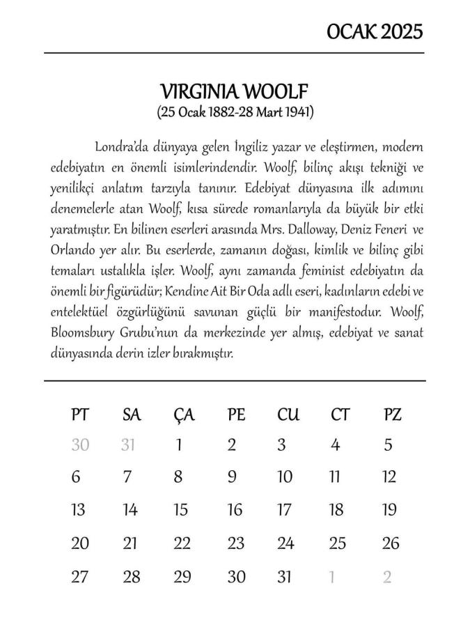 Kadın yazarların edebiyat dünyasındaki derin izlerini her ay farklı bir yazarla keşfedeceğiniz 2025 Kadın Yazarlar Ajandası, Ayrıkotu Kitap Yayınları'ndan çıkıyor. Her ay, dünya edebiyatının önemli bir kadın yazarına ayrılan sayfalarda, yalnızca yazarlık kimliklerine değil, aynı zamanda hayatlarına da dokunuyoruz.