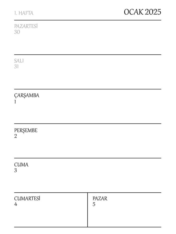Gün gün ayrılan bölümlerinde günlük planlarınızı yapabilir, size ayrılan özel sayfalarında ister kısa not alabilir, ister içinizden dökülenleri yazıya aktarabilirsiniz.