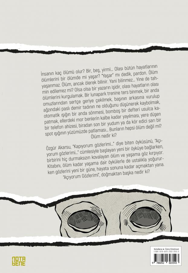 Özgür Akarsu, “Kapıyorum gözlerimi...” diye biten öyküsünü, “Açıyorum gözlerimi...” cümlesiyle başlayan yeni bir öyküye bağlarken, birbirini hiç durmaksızın kovalayan ölüm ve yaşama göz kırpıyor. Kitabını, ölüm kadar yaşama dair öykülerle de ustalıkla yoğururken gözlerini yeni bir güne, hayata sonuna kadar açmaktan yana.