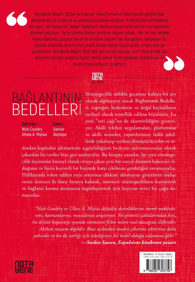 Sömürgecilik sıklıkla geçmişte kalmış bir şey olarak algılanıyor ancak Bağlantının Bedelleri, toprağın, bedenlerin ve doğal kaynakların tarihsel olarak temellük edilme biçiminin, bu yeni “veri çağı”na da aksettirildiğini gösteriyor. Akıllı telefon uygulamaları, platformlar ve akıllı nesneler, yaşamlarımızı farklı şekillerde yakalayıp verilere dönüştürüyorlar ve ardından kapitalist işletmelerin açgözlülüğünü besleyen enformasyonlar olarak çıkarılan bu veriler bize geri satılıyorlar. Bu kitapta yazarlar, bu yeni sömürgecilik biçiminin küresel olarak ortaya çıkan yeni bir sosyal düzenin habercisi olduğunu ve buna kuvvetli bir biçimde karşı çıkılması gerektiğini savunuyorlar. Hâlihazırda tolere edilen veya yeterince dikkate alınmayan gözetimin endişe verici derecesi ile karşı karşıya kalarak, interneti sömürgecilikten kurtarmak ve bağlantı kurma arzumuzu özgürleştirmek için heyecan verici bir çağrı sunuyorlar. “Nick Couldry ve Ulises A. Mejias dijitalin derinliklerine inerek mekânlarını, katmanlarını, mevzilerini araştırıyor. Yol gösterici çabalarından biri, bu dijital kapasiteyi oyunda tutmanın fiilen nelere mal olacağına ilişkindir. Akıbeti masum değildir: Bazı açılardan maden çıkarma sektörüne daha yakındır ve bu da varlığı için ödediğimiz bir bedel olduğu anlamına gelir.”