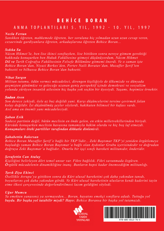Bu kitap TİP Genel Başkanı Behice Boran'ın mezarı başında yapılan 5. ve 10.yıl anmalarında yapılan konuşmalardan bir derlemedir.Anısına ve mücadelesine saygıyla..