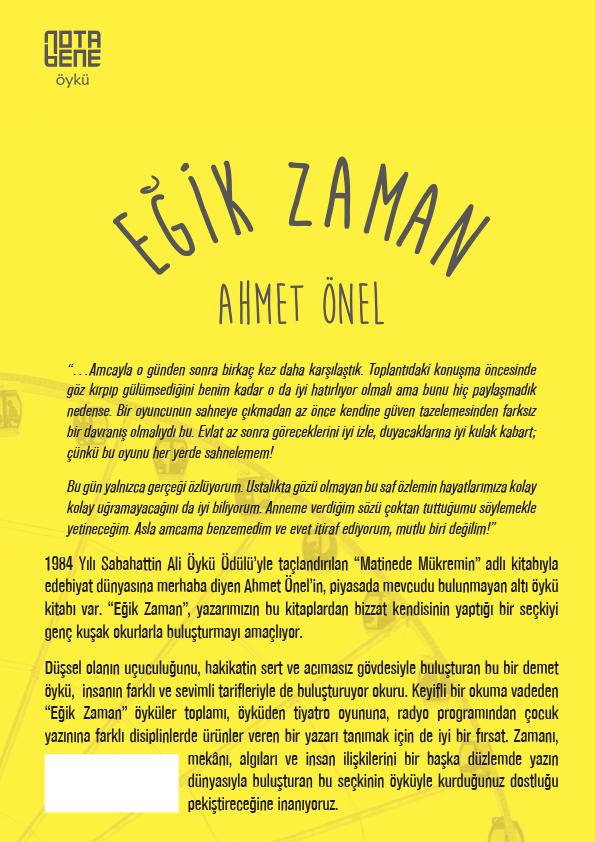1984 Yılı Sabahattin Ali Öykü Ödülü'yle taçlandırılan “Matinede Mükremin” adlı kitabıyla edebiyat dünyasına merhaba diyen Ahmet Önel'in, piyasada mevcudu bulunmayan altı öykü kitabı var. “Eğik Zaman”, yazarımızın bu kitaplardan bizzat kendisinin yaptığı bir seçkiyi genç kuşak okurlarla buluşturmayı amaçlıyor.