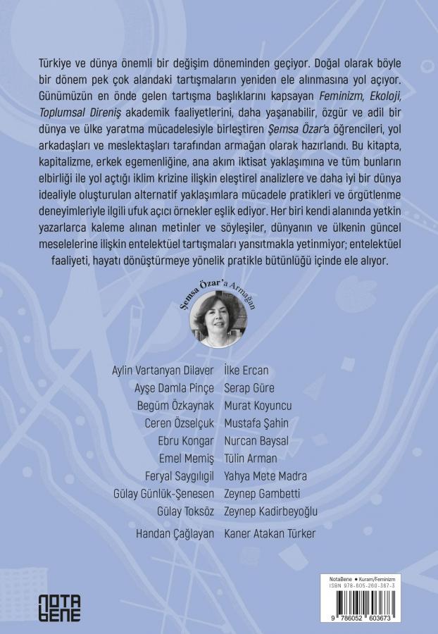 Türkiye ve dünya önemli bir değişim döneminden geçiyor. Doğal olarak böyle bir dönem pek çok alandaki tartışmaların yeniden ele alınmasına yol açıyor. Günümüzün en önde gelen tartışma başlıklarını kapsayan Feminizm, Ekoloji, Toplumsal Direniş akademik faaliyetlerini, daha yaşanabilir, özgür ve adil bir dünya ve ülke yaratma mücadelesiyle birleştiren Şemsa Özar’a öğrencileri, yol arkadaşları ve meslektaşları tarafından armağan olarak hazırlandı. Bu kitapta, kapitalizme, erkek egemenliğine, ana akım iktisat yaklaşımına ve tüm bunların elbirliği ile yol açtığı iklim krizine ilişkin eleştirel analizlere ve daha iyi bir dünya idealiyle oluşturulan alternatif yaklaşımlara mücadele pratikleri ve örgütlenme deneyimleriyle ilgili ufuk açıcı örnekler eşlik ediyor. Her biri kendi alanında yetkin yazarlarca kaleme alınan metinler ve söyleşiler, dünyanın ve ülkenin güncel meselelerine ilişkin entelektüel tartışmaları yansıtmakla yetinmiyor; entelektüel faaliyeti, hayatı dönüştürmeye yönelik pratikle bütünlüğü içinde ele alıyor.