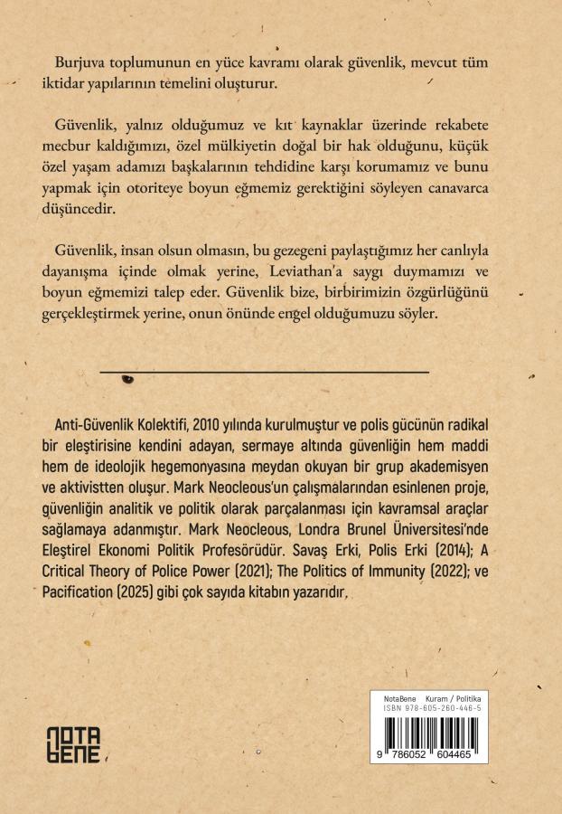Anti-Güvenlik Kolektifi, 2010 yılında kurulmuştur ve polis gücünün radikal bir eleştirisine kendini adayan, sermaye altında güvenliğin hem maddi hem de ideolojik hegemonyasına meydan okuyan bir grup akademisyen ve aktivistten oluşur. Mark Neocleous'un çalışmalarından esinlenen proje, güvenliğin analitik ve politik olarak parçalanması için kavramsal araçlar sağlamaya adanmıştır. Mark Neocleous, Londra Brunel Üniversitesi'nde Eleştirel Ekonomi Politik Profesörüdür. Savaş Erki, Polis Erki (2014); A Critical Theory of Police Power (2021); The Politics of Immunity (2022); ve Pacification (2025) gibi çok sayıda kitabın yazarıdır.
