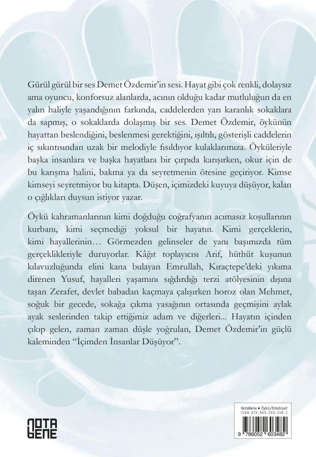 Öykü kahramanlarının kimi doğduğu coğrafyanın acımasız koşullarının kurbanı, kimi seçmediği yoksul bir hayatın. Kimi gerçeklerin, kimi hayallerinin… Görmezden gelinseler de yanı başımızda tüm gerçeklikleriyle duruyorlar. Kâğıt toplayıcısı Arif, hüthüt kuşunun kılavuzluğunda elini kana bulayan Emrullah, Kıraçtepe’deki yıkıma direnen Yusuf, hayalleri yaşamını sığdırdığı terzi atölyesinin dışına taşan Zerafet, devlet babadan kaçmaya çalışırken horoz olan Mehmet, soğuk bir gecede, sokağa çıkma yasağının ortasında geçmişini aylak ayak seslerinden takip ettiğimiz adam ve diğerleri... Hayatın içinden çıkıp gelen, zaman zaman düşle yoğrulan, Demet Özdemir’in güçlü kaleminden “İçimden İnsanlar Düşüyor”.