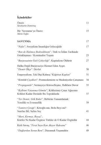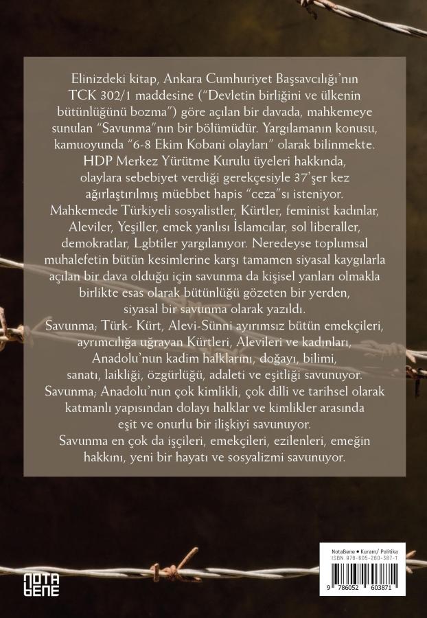Elinizdeki kitap, Ankara Cumhuriyet Başsavcılığı’nın TCK 302/1 maddesine (Devletin birliğini ve ülkenin bütünlüğünü bozma) göre açılan bir davada, mahkemeye sunulan “Savunma”nın bir bölümüdür. Yargılamanın konusu, kamuoyunda “6-8 Ekim Kobani olayları” olarak bilinmekte. HDP Merkez Yürütme Kurulu üyeleri hakkında, olaylara sebebiyet verdiği gerekçesiyle 37’şer kez ağırlaştırılmış müebbet hapis “ceza”sı isteniyor. Mahkemede Türkiyeli sosyalistler, Kürtler, feminist kadınlar, Aleviler, Yeşiller, emek yanlısı İslamcılar, sol liberaller, demokratlar, LGBTİ+’lar yargılanıyor. Neredeyse toplumsal muhalefetin bütün kesimlerine karşı, tamamen siyasal kaygılarla açılan bir dava olduğu için, savunma da kişisel yanları olmakla birlikte esas olarak bütünlüğü gözeten bir yerden, siyasal bir savunma olarak yazıldı.