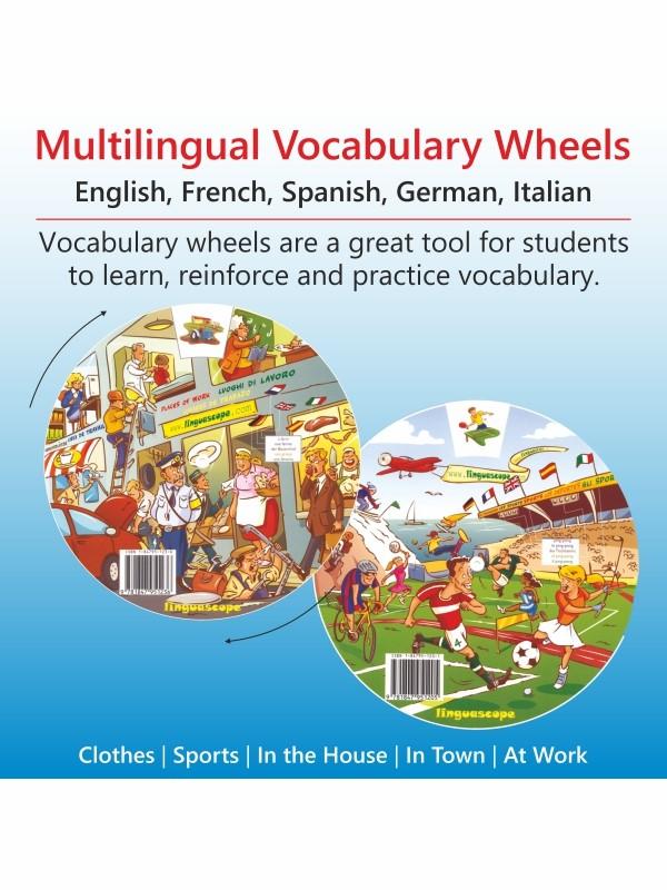 Vocabulary wheels are a great tool for students to learn, reinforce and practice vocabulary. Each wheel covers one topic and includes 32 items of vocabulary. As students turn the wheel, each picture can be seen accompanied by the corresponding word in 5 different languages (English, French, Spanish, German and Italian).