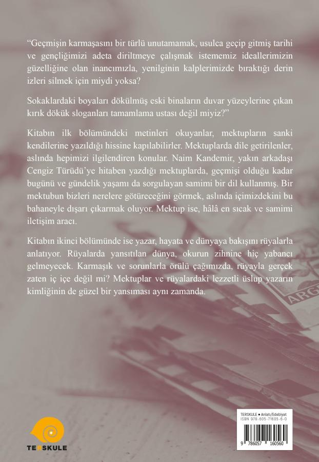 Kitabın ilk bölümündeki metinleri okuyanlar, mektupların sanki kendilerine yazıldığı hissine kapılabilirler. Mektuplarda dile getirilenler, aslında hepimizi ilgilendiren konular. Naim Kandemir, yakın arkadaşı Cengiz Türüdü'ye hitaben yazdığı mektuplarda, geçmişi olduğu kadar bugünü ve gündelik yaşamı da sorgulayan samimi bir dil kullanmış. Bir mektubun bizleri nerelere götüreceğini görmek, aslında içimizdekini bu bahaneyle dışarı çıkarmak oluyor. Mektup ise, hâlâ en sıcak ve samimi iletişim aracı.