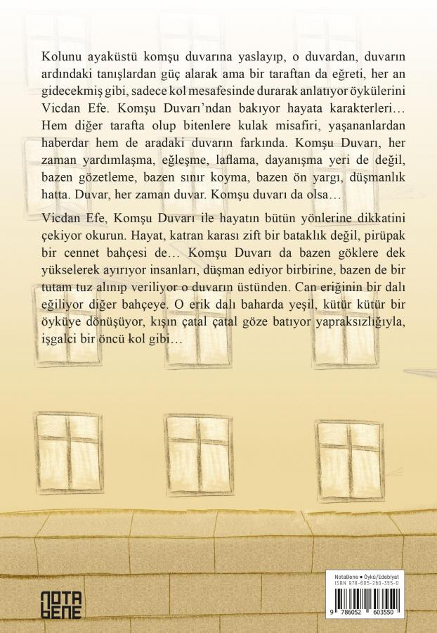Kolunu ayaküstü komşu duvarına yaslayıp, o duvardan, duvarın ardındaki tanışlardan güç alarak ama bir taraftan da eğreti, her an gidecekmiş gibi, sadece kol mesafesinde durarak anlatıyor öykülerini Vicdan Efe. Komşu Duvarı'ndan bakıyor hayata karakterleri... Hem diğer tarafta olup bitenlere kulak misafiri, yaşananlardan haberdar hem de aradaki duvarın farkında. Komşu Duvarı, her zaman yardımlaşma, eğleşme, laflama, dayanışma yeri de değil, bazen gözetleme, bazen sınır koyma, bazen ön yargı, düşmanlık hatta. Duvar, her zaman duvar. Komşu duvarı da olsa...