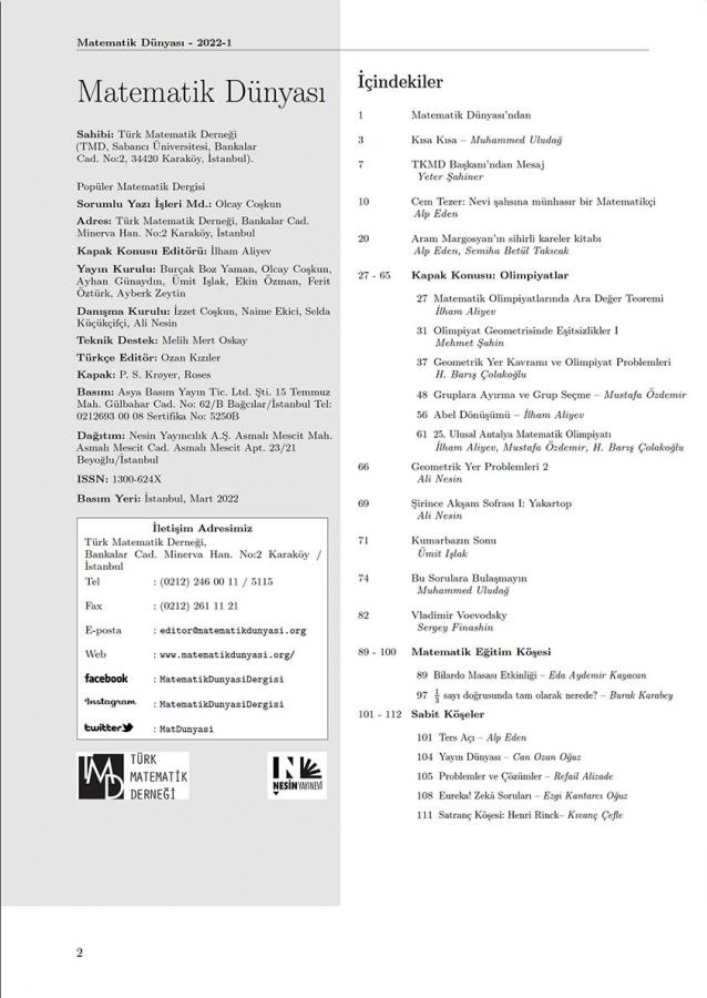 - Matematik Dünyası İlham Aliyev editörlüğünde hazırlanan Bahar 2022 sayısı ile karşınızda!Bu sayıda kapak konumuz Matematik Olimpiyatları. İlham Aliyev ve ekibinin hazırladığı problemler olimpiyata hazırlananlar kadar her yaştan matematik severin de ilgisini çekecektir. Derginin bu sayısında öne çıkan diğer başlıklar arasında, 1993-1996 yıllarında dergimizin yayın kurulunda bulunan ve 2020'de aramızdan ayrılan Cem Tezer, 10 yılını kutlayan Türkiye Kadın Matematikçiler Derneği, Ali Nesin'in bir önceki sayımızda başladığı Geometrik Yer Problemleri dizisinin devamı ve Matematik Eğitimi Köşesi isimli yepyeni köşemiz bulunuyor. Haziran sayımızda buluşmak ümidiyle. Keyifli okumalar.Stok Kodu:9771300624012 24Boyut:19,5 x 27,5 cmSayfa Sayısı:112Basım Yeri:İstanbulBaskı:1Basım Tarihi:Mart 2022Kapak Türü:Karton KapakKağıt Türü:Kitap KağıdıDili:Türkçe