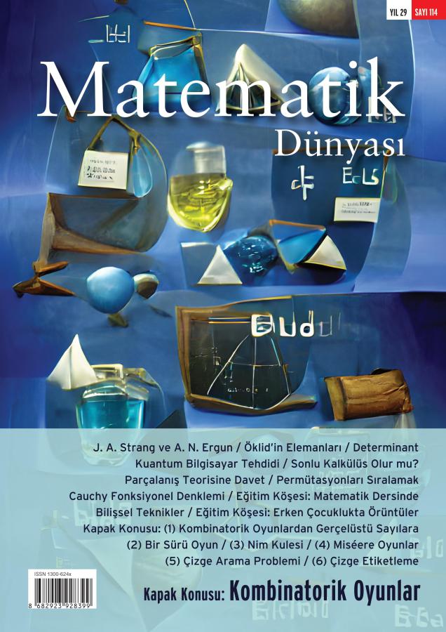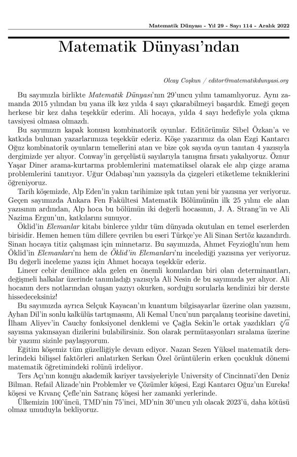 Bu sayıda Kombinatorik Oyunlar'ı kapak konumuza taşıyoruz. Ezgi Kantarcı Oğuz'un kaleme aldığı dört yazı ile kombinatorik oyunlara dair ayrıntılı bilgilere ulaşabilirsiniz. Kapak konusunun yanı sıra Ali Nesin'in lineer cebirin en önemli konularından determinantlar üzerine bir ders notu niteliğindeki yazısını ve binlerce yıldır okutulan Öklid'in Elemanları kitabı üzerine Ahmet Feyzioğlu'nun detaylı incelemesini bu sayıda okuyabilirsiniz. Bu sayıda ilgiyle takip ettiğiniz köşelerimizi her zamanki yerlerinde bulacaksınız. Yeni yılda, yeni sayılarda buluşmak umuduyla. İyi okumalar