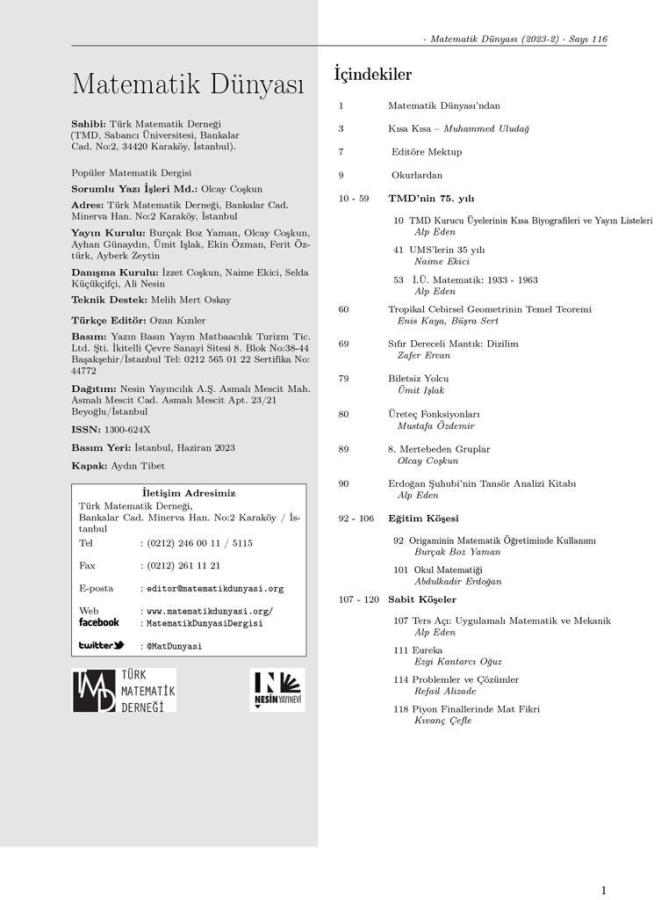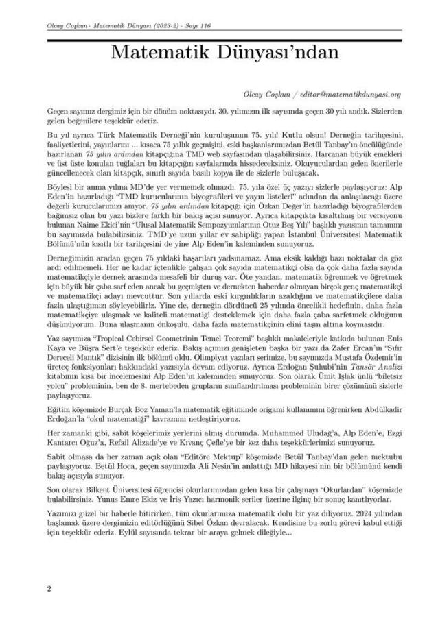 Bu yıl ayrıca Türk Matematik Derneği’nin kuruluşunun 75. yılı! Kutlu olsun! Derneğin tarihçesini, faaliyetlerini, yayınlarını ... kısaca 75 yıllık geçmişini, eski başkanlarımızdan Betül Tanbay’ın öncülüğünde hazırlanan 75 yılın ardından kitapçığına TMD web sayfasından ulaşabilirsiniz. Harcanan büyük emekleri ve üst üste konulan tuğlaları bu kitapçığın sayfalarında hissedeceksiniz. Okuyuculardan gelen önerilerle güncellenecek olan kitapçık, sınırlı sayıda basılı kopya ile de sizlerle buluşacak.