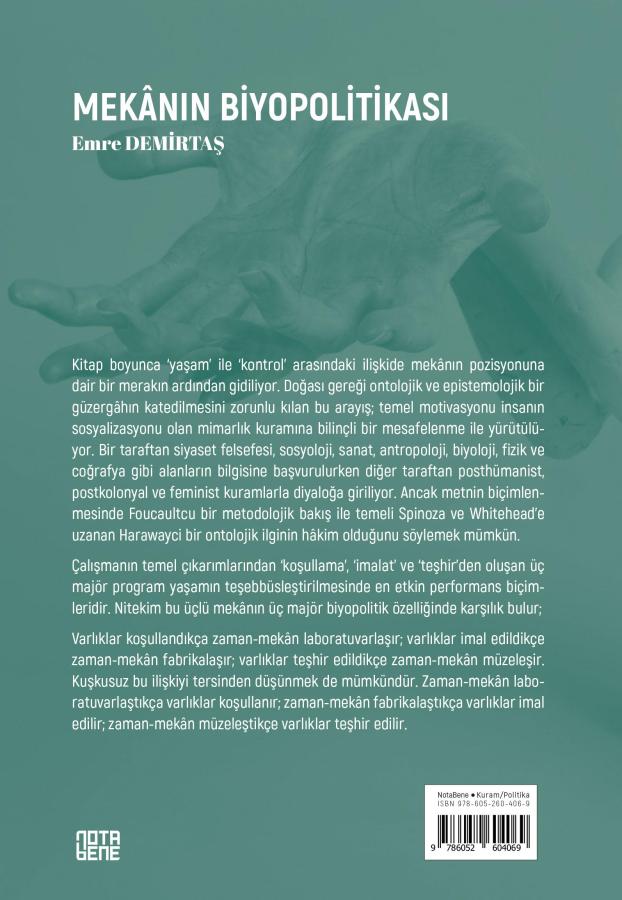 Kitap boyunca ‘yaşam’ ile ‘kontrol’ arasındaki ilişkide mekânın pozisyonuna dair bir merakın ardından gidiliyor. Doğası gereği ontolojik ve epistemolojik bir güzergâhın katedilmesini zorunlu kılan bu arayış; temel motivasyonu insanın sosyalizasyonu olan mimarlık kuramına bilinçli bir mesafelenme ile yürütülüyor. Bir taraftan siyaset felsefesi, sosyoloji, sanat, antropoloji, biyoloji, fizik ve coğrafya gibi alanların bilgisine başvurulurken diğer taraftan posthümanist, postkolonyal ve feminist kuramlarla diyaloğa giriliyor. Ancak metnin biçimlen mesinde Foucaultcu bir metodolojik bakış ile temeli Spinoza ve Whitehead’e uzanan Harawayci bir ontolojik ilginin hâkim olduğunu söylemek mümkün. Çalışmanın temel çıkarımlarından ‘koşullama’, ‘imalat’ ve ‘teşhir’den oluşan üç majör program yaşamın teşebbüsleştirilmesinde en etkin performans biçimleridir. Nitekim bu üçlü mekânın üç majör biyopolitik özelliğinde karşılık bulur; Varlıklar koşullandıkça zaman-mekân laboratuvarlaşır; varlıklar imal edildikçe zaman-mekân fabrikalaşır; varlıklar teşhir edildikçe zaman-mekân müzeleşir. Kuşkusuz bu ilişkiyi tersinden düşünmek de mümkündür. Zaman-mekân labo ratuvarlaştıkça varlıklar koşullanır; zaman-mekân fabrikalaştıkça varlıklar imal edilir; zaman-mekân müzeleştikçe varlıklar teşhir edilir.