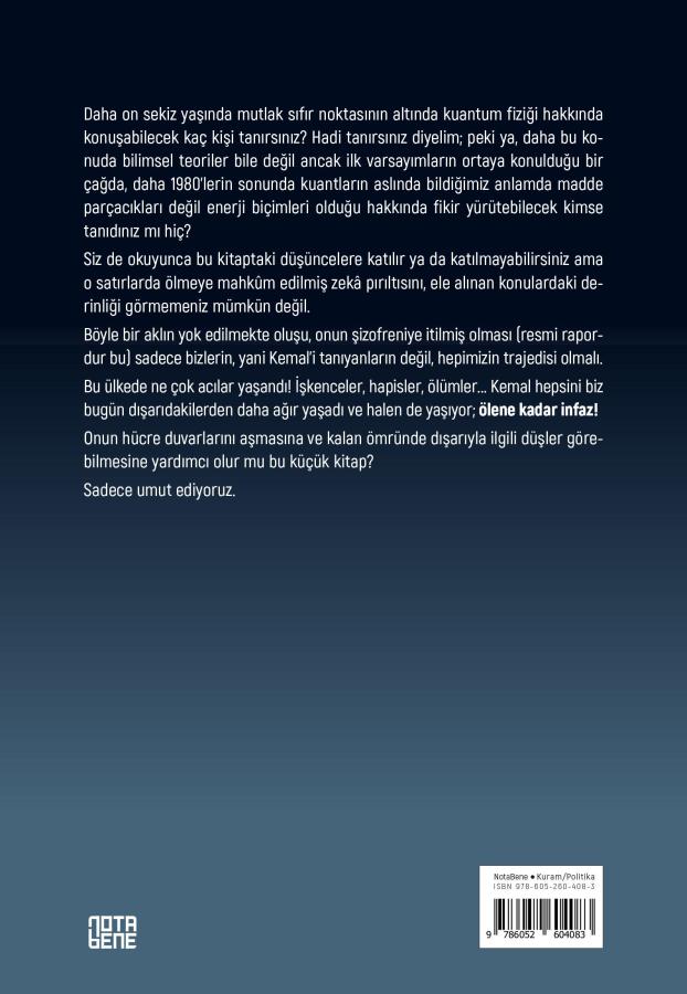 Siz de okuyunca bu kitaptaki düşüncelere katılır ya da katılmayabilirsiniz ama o satırlarda ölmeye mahkûm edilmiş zekâ pırıltısını, ele alınan konulardaki derinliği görmemeniz mümkün değil. Böyle bir aklın yok edilmekte oluşu, onun şizofreniye itilmiş olması (resmi rapordur bu) sadece bizlerin, yani Kemal’i tanıyanların değil, hepimizin trajedisi olmalı.