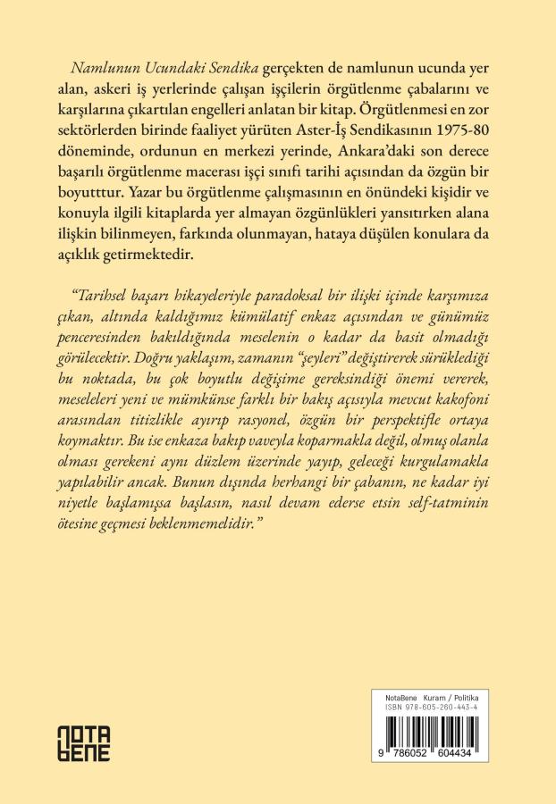 Namlunun Ucundaki Sendika gerçekten de namlunun ucunda yer alan, askeri iş yerlerinde çalışan işçilerin örgütlenme çabalarını ve karşılarına çıkartılan engelleri anlatan bir kitap. Örgütlenmesi en zor sektörlerden birinde faaliyet yürüten Aster-İş Sendikasının 1975-80 döneminde, ordunun en merkezi yerinde, Ankara’daki son derece başarılı örgütlenme macerası işçi sınıfı tarihi açısından da özgün bir boyuttur. Yazar bu örgütlenme çalışmasının en önündeki kişidir ve konuyla ilgili kitaplarda yer almayan özgünlükleri yansıtırken alana ilişkin bilinmeyen, farkında olunmayan, hataya düşülen konulara da açıklık getirmektedir.
