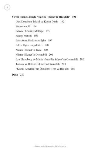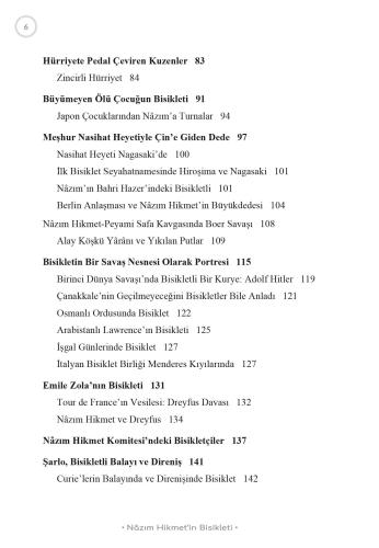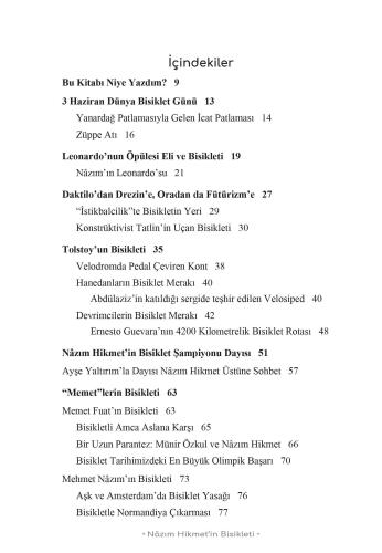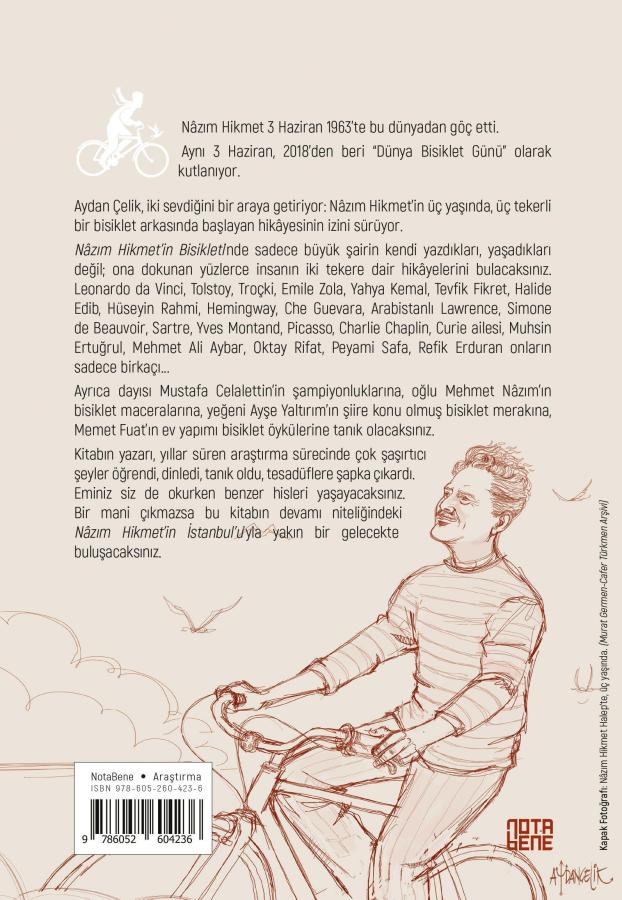 Nâzım Hikmet’in Bisikleti’nde sadece büyük şairin kendi yazdıkları, yaşadıkları değil; ona dokunan yüzlerce insanın iki tekere dair hikâyelerini bulacaksınız. Leonardo da Vinci, Tolstoy, Troçki, Emile Zola, Yahya Kemal, Tevfik Fikret, Halide Edib, Hüseyin Rahmi, Hemingway, Che Guevara, Arabistanlı Lawrence, Simone de Beauvoir, Sartre, Yves Montand, Picasso, Charlie Chaplin, Frederic-Joliot Curie, Muhsin Ertuğrul, Mehmet Ali Aybar, Oktay Rifat, Refik Erduran onların sadece birkaçı…