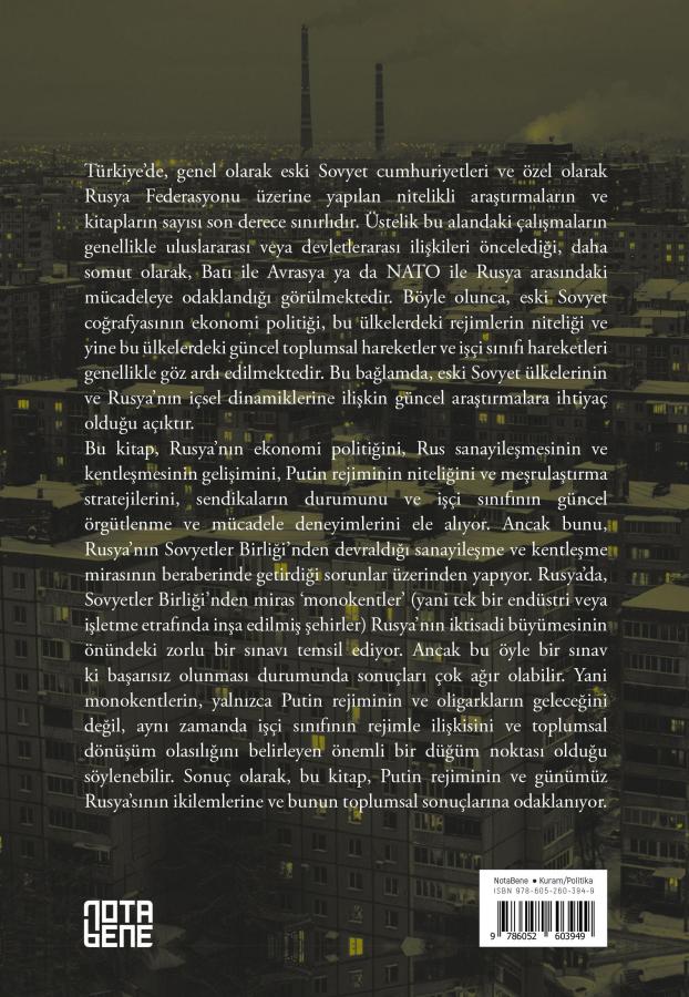 Bu kitap, Rusya’nın ekonomi politiğini, Rus sanayileşmesinin ve kentleşmesinin gelişimini, Putin rejiminin niteliğini ve meşrulaştırma stratejilerini, sendikaların durumunu ve işçi sınıfının güncel örgütlenme ve mücadele deneyimlerini ele alıyor. Ancak bunu, Rusya’nın Sovyetler Birliği’nden devraldığı sanayileşme ve kentleşme mirasının beraberinde getirdiği sorunlar üzerinden yapıyor. Rusya’da, Sovyetler Birliği’nden miras ‘monokentler’ (yani tek bir endüstri veya işletme etrafında inşa edilmiş şehirler) Rusya’nın iktisadi büyümesinin önündeki zorlu bir sınavı temsil ediyor. Ancak bu öyle bir sınav ki başarısız olunması durumunda sonuçları çok ağır olabilir. Yani monokentlerin, yalnızca Putin rejiminin ve oligarkların geleceğini değil, aynı zamanda işçi sınıfının rejimle ilişkisini ve toplumsal dönüşüm olasılığını belirleyen önemli bir düğüm noktası olduğu söylenebilir. Sonuç olarak, bu kitap, Putin rejiminin ve günümüz Rusya’sının ikilemlerine ve bunun toplumsal sonuçlarına odaklanıyor.