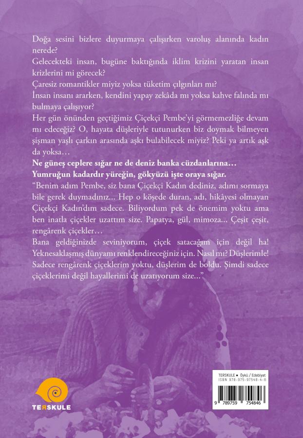 “Benim adım Pembe, siz bana Çiçekçi Kadın dediniz, adımı sormaya bile gerek duymadınız... Hep o köşede duran, adı, hikâyesi olmayan Çiçekçi Kadın’dım sadece. Biliyordum pek de önemim yoktu ama ben inatla çiçekler uzattım size. Papatya, gül, mimoza... Çeşit çeşit, rengârenk çiçekler…