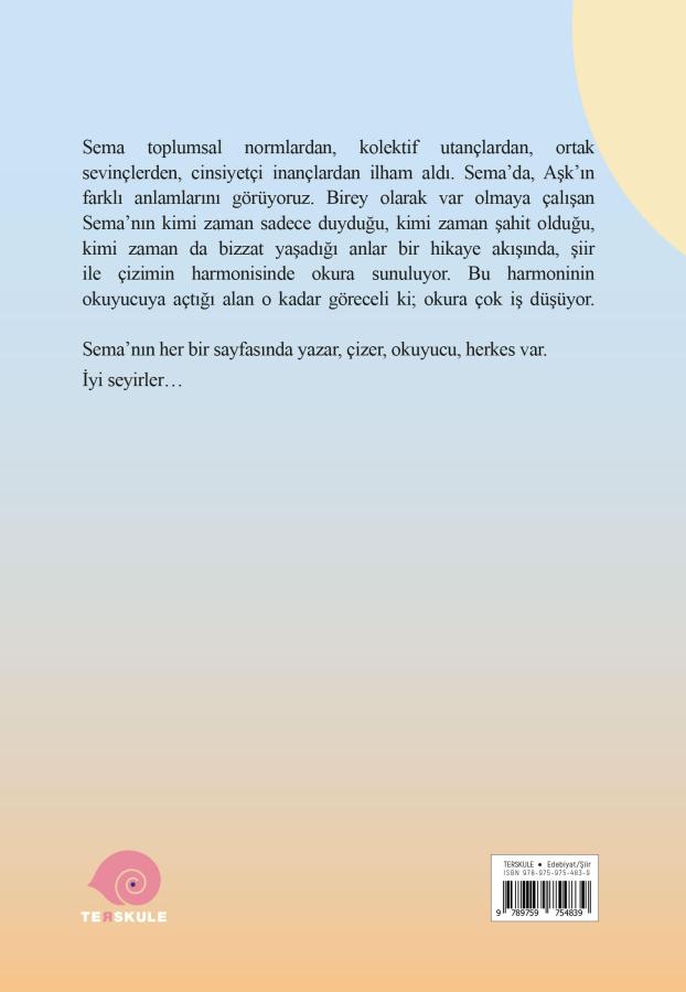 Sema toplumsal normlardan, kolektif utançlardan, ortak sevinçlerden, cinsiyetçi inançlardan ilham aldı. Sema’da, Aşk’ın farklı anlamlarını görüyoruz. Birey olarak var olmaya çalışan Sema’nın kimi zaman sadece duyduğu, kimi zaman şahit olduğu, kimi zaman da bizzat yaşadığı anlar bir hikaye akışında, şiir ile çizimin harmonisinde okura sunuluyor. Bu harmoninin okuyucuya açtığı alan o kadar göreceli ki; okura çok iş düşüyor. Sema’nın her bir sayfasında yazar, çizer, okuyucu, herkes var.
