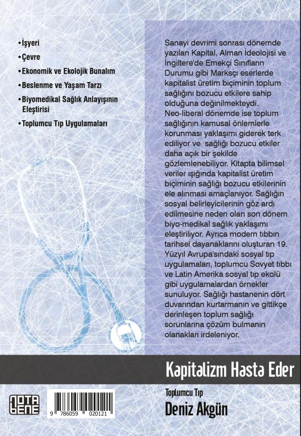 Sanayi devrimi sonrası dönemde yazılan Kapital, Alman İdeolojisi ve İngiltere'de Emekçi Sınıfların Durumu gibi Marksçı eserlerde kapitalist üretim biçiminin toplum sağlığını bozucu etkilere sahip olduğuna değinilmekteydi. 20. Yüzyıl'da toplumun sağlığının korunmasına yönelik kamusal hizmetler yeni kurulan sosyalist ülkelerin öncelikleri arasındaydı. Sınıfsal eşitsizliklerin etkisini azaltma işlevini üstlenen ve hasta olanların kamu kaynakları kullanılarak iyileştirilmesine yönelik ulusal sağlık hizmetleri ise sosyal yönelimli kapitalist ülkelerin öncelikleri arasında yer aldı. Her iki yaklaşım da bireylerin sağlıklarının toplumun sorumluluğunda olduğu ön kabulüne dayanıyordu. 1970'li yıllardan sonra ortaya çıkan neo-liberal dönemde ise toplum sağlığının kamusal önlemlerle korunması yaklaşımı giderek terk edildi. Sağlığı korumanın kamusal sorumluluk yerine kişilerin kendi sorumluluğunda olduğu görüşü sıkça dile getirilir oldu. Kitapta bilimsel veriler kullanılarak ve eleştirel yaklaşımla, günümüzde giderek denetim dışı kalan kapitalist üretim ilişkilerinin sağlığı bozucu etkilerinin tartışılması amaçlanıyor. Yaygınlaşan sağlık sorunlarının toplumsal nedenlerinin irdelenmesi gerektiği vurgulanıyor.