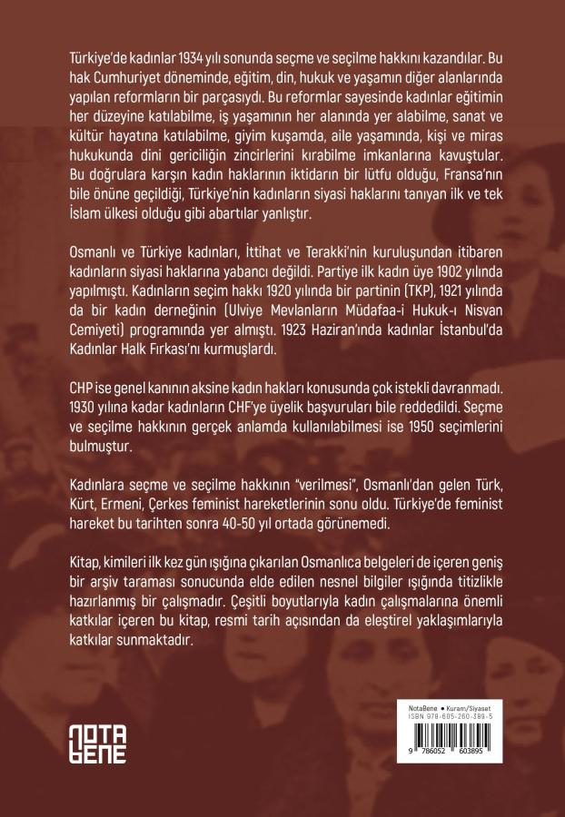 Türkiye’de kadınlar 1934 yılı sonunda seçme ve seçilme hakkını kazandılar. Bu hak Cumhuriyet döneminde, eğitim, din, hukuk ve yaşamın diğer alanlarında yapılan reformların bir parçasıydı. Bu reformlar sayesinde kadınlar eğitimin her düzeyine katılabilme, iş yaşamının her alanında yer alabilme, sanat ve kültür hayatına katılabilme, giyim kuşamda, aile yaşamında, kişi ve miras hukukunda dini gericiliğin zincirlerini kırabilme imkanlarına kavuştular. Bu doğrulara karşın kadın haklarının iktidarın bir lütfu olduğu, Fransa’nın bile önüne geçildiği, Türkiye’nin kadınların siyasi haklarını tanıyan ilk ve tek İslam ülkesi olduğu gibi abartılar yanlıştır.