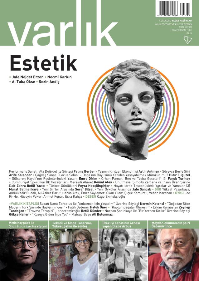- Dosya: “Estetik” – Jale Nejdet Erzen, Necmi Karkın, A. Tuba Ökse, Sezin AndiçYazı: Performans Sanatı: Ata Doğruel ile Söyleşi (Fatma Berber) – Meydan Okumaların Şairi Özdemir İnce (Elçin Sevgi Suçin) – Yazının Kırılgan Ekonomisi (Aylin Antmen) – Öteki'yi Sanatının Öznesi Yapan Fotoğraf Sanatçısı Diane Arbus (Raşel Rakella Asal) – Tekstil ve Moda Tasarımı: Yüksel Şahin ile Söyleşi (Mine Bican) – Süreyya Berfe Şiiri (Arife Kalender) –Çağdaş Sanat: “Locus Solus”: Doğa'nın Büyüsünü Yeniden Yaşayabilmek Mümkün mü? (Hıdır Eligüzel) – Gülseren Kayalı'nın Resimlerindeki Yaşam (Emre Dirim) – Orhan Pamuk, Ben ve “Veba Geceleri” [2] (Faruk Turinay) – Cumhuriyet Sporunun İlk Gözağrıları: Mersinli Ahmet (Kemal Ateş) – Unutmaya, Şimdiki Zamana ve İhsan Üren Şiirine Dair (Zehra Betül Yazıcı) – Türkçe Günlükleri (Feyza Hepçilingirler) – Hayatı İdrak Teşebbüsleri: Yaralar ve Yamalar [3] (Murat Batmankaya) – Yeni Şiirler Arasında (Şeref Bilsel) – Yeni Öyküler Arasında (Jale Sancak)Şiir: Yüksel Pazarkaya, Abdülkadir Budak, Ali Asker Barut, Harun Atak, Emre Söylemez, Okan Yıldız, Çiçek Kömürcü, Vehan KarahanÖykü: Lee Ki-Ho, Hüseyin Peker, Ahmet Fenar, Esra KahyaDesen: Özge EkmekçioğluVarlık Kitaplığı: Metin Kaygalak ile “Siyah Divan” Üzerine Söyleşi (Nilay Özer - Mehmet Altun) – “Doğadan Söze Modern Türk Şiirinde Hayvan İmgesi” - Fatih Özdemir (Haluk Öner) – Suzan Nana Tarablus ile “Anlatmak İçin Yaşadım” Üzerine Söyleşi (Nermin Ketenci) – “Kaplumbağalar Ölmesin” - Erkan Karaaslan (Zeynep Tandoğan) –“Travma Terapisi” - enderemiroğlu (Betül Dünder) – Nurhan Şahinkaya ile “Bir Yerden Kırılır” Üzerine Söyleşi (Gökçe Haner) – “Kuzeye Giden İnce Yol” - Matsuo Başo (Ali Bulunmaz)Edebiyattan resme, sinemadan sanat tarihine, gezi izlenimlerinden felsefeye geniş bir alanda yazılar, söyleşiler yayımlayan Varlık bu ay da Nasıl Anlatılır, Çağdaş Sanat, Performans Sanatı, Türkçe Günlükleri, Yeni Şiirler / Öyküler Arasında köşeleri ve son çıkan kitapların tanıtıldığı Varlık Kitaplığı bölümüyle okurlarıyla buluşuyor.Stok Kodu:1728-1383Boyut:19,5x27Basım Yeri:İstanbulKapak Türü:Karton KapakKağıt Türü:Kitap KağıdıDili:Türkçe