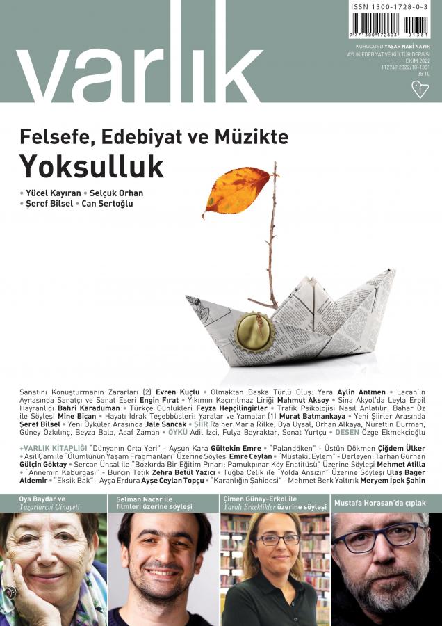 - Dosya: “Felsefe, Edebiyat ve Müzikte Yoksulluk” – Yücel Kayıran, Selçuk Orhan, Şeref Bilsel, Can SertoğluYazı: Sanatını Konuşturmanın Zararları (2) (Evren Kuçlu) – Olmaktan Başka Türlü Oluş: Yara (Aylin Antmen) – Lacan'ın Aynasında Sanatçı ve Sanat Eseri (Engin Fırat) – Bir Varlık Kipi Deşifresi: Mustafa Horasan'da Çıplak (Yalın Alpay) – Yıkımın Kaçınılmaz Liriği (Mahmut Aksoy) – Sina Akyol'da Leyla Erbil Hayranlığı (Bahri Karaduman) – Türkçe Günlükleri (Feyza Hepçilingirler) – Trafik Psikolojisi Nasıl Anlatılır: Bahar Öz ile Söyleşi (Mine Bican) – Hayatı İdrak Teşebbüsleri: Yaralar ve Yamalar (1) (Murat Batmankaya) – Kanayan Güvercinin Dilini Aramak: Oya Baydar ve “Yazarlarevi Cinayeti” (Hıdır Eligüzel) –Sinema: Selman Nacar ile Söyleşi (Fatma Berber) – Yeni Şiirler Arasında (Şeref Bilsel) – Yeni Öyküler Arasında (Jale Sancak)Şiir: Rainer Maria Rilke, Oya Uysal, Orhan Alkaya, Nurettin Durman, Güney Özkılınç, Beyza Bala, Asaf ZamanÖykü: Adil İzci, Fulya Bayraktar, Sonat YurtçuDesen: Özge EkmekçioğluVarlık Kitaplığı: Çimen Günay-Erkol ile “Yaralı Erkeklikler” Üzerine Söyleşi (Mazlum Vesek) – “Dünyanın Orta Yeri” - Aysun Kara (Gültekin Emre) – “Palandöken” - Üstün Dökmen (Çiğdem Ülker) – Asil Çam ile “Ölümlünün Yaşam Fragmanları” Üzerine Söyleşi (Emre Ceylan) – “Müstakil Eylem” - Derleyen: Tarhan Gürhan (Gülçin Göktay) – Sercan Ünsal ile “Bozkırda Bir Eğitim Pınarı: Pamukpınar Köy Enstitüsü” Üzerine Söyleşi (Mehmet Atilla) – “Annemin Kaburgası” - Burçin Tetik (Zehra Betül Yazıcı) – Tuğba Çelik ile “Yolda Ansızın” Üzerine Söyleşi (Ulaş Bager Aldemir) – “Eksik Bak” - Ayça Erdura (Ayşe Ceylan Topçu) – “Karanlığın Şahidesi” - Mehmet Berk Yaltırık (Meryem İpek Şahin)Edebiyattan resme, sinemadan sanat tarihine, gezi izlenimlerinden felsefeye geniş bir alanda yazılar, söyleşiler yayımlayan Varlık bu ay da Nasıl Anlatılır, Çağdaş Sanat, Türkçe Günlükleri, Sinema, Yeni Şiirler / Öyküler Arasında köşeleri ve son çıkan kitapların tanıtıldığı Varlık Kitaplığı bölümüyle okurlarıyla buluşuyor.Stok Kodu:1728-1381Boyut:19,5x27Basım Yeri:İstanbulKapak Türü:Karton KapakKağıt Türü:Kitap KağıdıDili:Türkçe