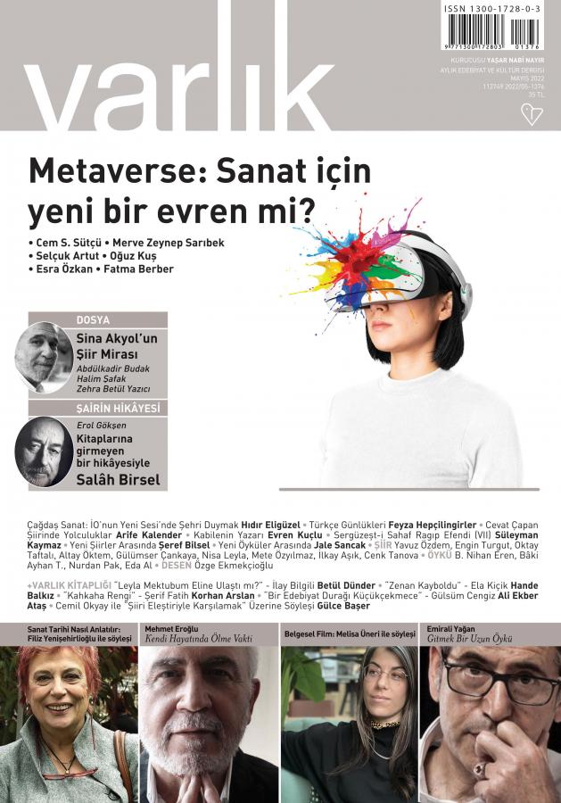 - Dosya: “Metaverse: Sanat için yeni bir evren mi?” – Cem S. Sütcü, Merve Zeynep Sarıbek, Selçuk Artut, Oğuz Kuş, Esra Özkan, Fatma Berber.Dosya: “Sina Akyol'un Şiir Mirası” – Abdülkadir Budak, Halim Şafak, Zehra Betül YazıcıŞairin Hikâyesi: “Kitaplarına girmeyen bir hikâyesiyle Salâh Birsel” – Erol GökşenYazı: Kabilenin Yazarı (Evren Kuçlu) – Sanat Tarihi Nasıl Anlatılır: Filiz Yenişehirlioğlu ile Söyleşi (Mine Bican) – Çağdaş Sanat: İO'nun Yeni Sesi'nde Şehri Duymak (Hıdır Eligüzel) – Türkçe Günlükleri (Feyza Hepçilingirler) – Cevat Çapan Şiirinde Yolculuklar (Arife Kalender) – Sergüzeşt-i Sahaf Ragıp Efendi (VII) (Süleyman Kaymaz) – Belgesel Film: Melisa Üneri ile Söyleşi (Fatma Berber) – Yeni Şiirler Arasında (Şeref Bilsel) – Yeni Öyküler Arasında (Jale Sancak)Şiir: Yavuz Özdem, Engin Turgut, Oktay Taftalı, Altay Öktem, Gülümser Çankaya, Nisa Leyla, Mete Özyılmaz, İlkay Aşık, Cenk TanovaÖykü: B. Nihan Eren, Bâki Ayhan T., Nurdan Pak, Eda AlDesen: Özge EkmekçioğluVarlık Kitaplığı: “Kendi Hayatında Ölme Vakti” - Mehmet Eroğlu (Çiğdem Ülker) – “Leyla Mektubum Eline Ulaştı mı?” - İlay Bilgili (Betül Dünder) – “Zenan Kayboldu” - Ela Kiçik (Hande Balkız) – “Gitmek Bir Uzun Öykü” - Emirali Yağan (Hıdır Işık) – “Kahkaha Rengi” - Şerif Fatih (Korhan Arslan) – “Bir Edebiyat Durağı Küçükçekmece” - Gülsüm Cengiz (Ali Ekber Ataş) – Cemil Okyay ile “Şiiri Eleştiriyle Karşılamak” Üzerine Söyleşi (Gülce Başer)Edebiyattan resme, sinemadan sanat tarihine, gezi izlenimlerinden felsefeye geniş bir alanda yazılar, söyleşiler yayımlayan Varlık bu ay da Şairin Hikâyesi, Çağdaş Sanat, Türkçe Günlükleri, Nasıl Anlatılır?, Belgesel Film, Yeni Şiirler / Öyküler Arasında köşeleri ve son çıkan kitapların tanıtıldığı Varlık Kitaplığı bölümüyle okurlarıyla buluşuyor.Stok Kodu:1728-1376Boyut:19,5x27Basım Yeri:İstanbulKapak Türü:Karton KapakKağıt Türü:Kitap KağıdıDili:Türkçe