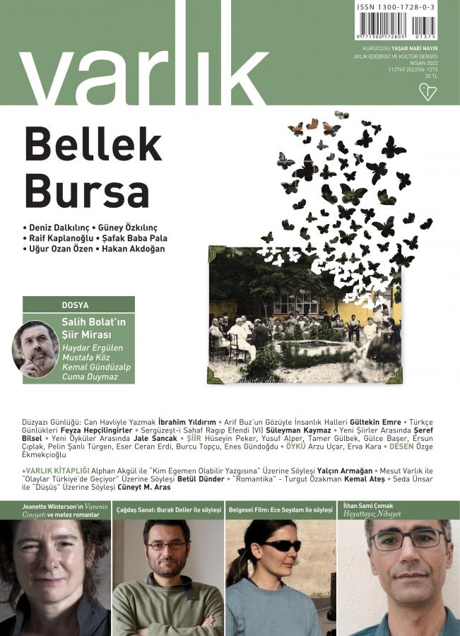 - Dosya: “Bellek Bursa” – Deniz Dalkılınç, Güney Özkılınç, Raif Kaplanoğlu, Şafak Baba Pala, Uğur Ozan Özen, Hakan AkdoğanDosya: “Salih Bolat'ın Şiir Mirası” – Haydar Ergülen, Mustafa Köz, Kemal Gündüzalp, Cuma DuymazYazı/Söyleşi: Düzyazı Günlüğü: Can Havliyle Yazmak (İbrahim Yıldırım) – Mendel'in Melez Bezelyelerinden Winterson'ın “Vişnenin Cinsiyeti”ne: Melez Romanlar (Zehra Betül Yazıcı) – Belgesel Film: Ece Soydam ile Söyleşi (Fatma Berber) – Arif Buz'un Gözüyle İnsanlık Halleri (Gültekin Emre) – Türkçe Günlükleri (Feyza Hepçilingirler) –Çağdaş Sanat: Burak Delier ile Söyleşi (Hıdır Eligüzel) – Sergüzeşt-i Sahaf Ragıp Efendi - VI (Süleyman Kaymaz) – Yeni Şiirler Arasında (Şeref Bilsel) – Yeni Öyküler Arasında (Jale Sancak)Şiir: Hüseyin Peker, Yusuf Alper, Tamer Gülbek, Gülce Başer, Ersun Çıplak, Pelin Şanlı Türgen, Eser Ceran Erdi, Burcu Topçu, Enes GündoğduÖykü: Arzu Uçar, Erva KaraDesen: Özge EkmekçioğluVarlık Kitaplığı: Alphan Akgül ile “Kim Egemen Olabilir Yazgısına” Üzerine Söyleşi (Yalçın Armağan) – “Hayattayız Nihayet” - İlhan Sami Çomak (Erkut Tokman) – Mesut Varlık ile “Olaylar Türkiye'de Geçiyor” Üzerine Söyleşi (Betül Dünder) – “Romantika” - Turgut Özakman (Kemal Ateş) – Seda Ünsar ile “Düşüş” Üzerine Söyleşi (Cüneyt M. Aras)Edebiyattan resme, sinemadan sanat tarihine, gezi izlenimlerinden felsefeye geniş bir alanda yazılar, söyleşiler yayımlayan Varlık bu ay da Çağdaş Sanat, Türkçe Günlükleri, Belgesel Film, Düzyazı Günlüğü, Yeni Şiirler / Öyküler Arasında köşeleri ve son çıkan kitapların tanıtıldığı Varlık Kitaplığı bölümüyle okurlarıyla buluşuyor.Stok Kodu:1728-1375Basım Yeri:İstanbulKapak Türü:Karton KapakKağıt Türü:Kitap KağıdıDili:Türkçe