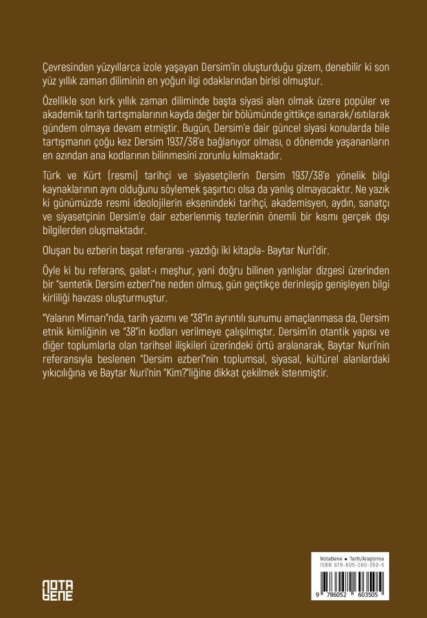 “Yalanın Mimarı”nda, tarih yazımı ve “38”in ayrıntılı sunumu amaçlanmasa da, Dersim etnik kimliğinin ve “38”in kodları verilmeye çalışılmıştır. Dersim’in otantik yapısı ve diğer toplumlarla olan tarihsel ilişkileri üzerindeki örtü aralanarak, Baytar Nuri’nin referansıyla beslenen “Dersim ezberi”nin toplumsal, siyasal, kültürel alanlardaki yıkıcılığına ve Baytar Nuri’nin “Kim?”liğine dikkat çekilmek istenmiştir.