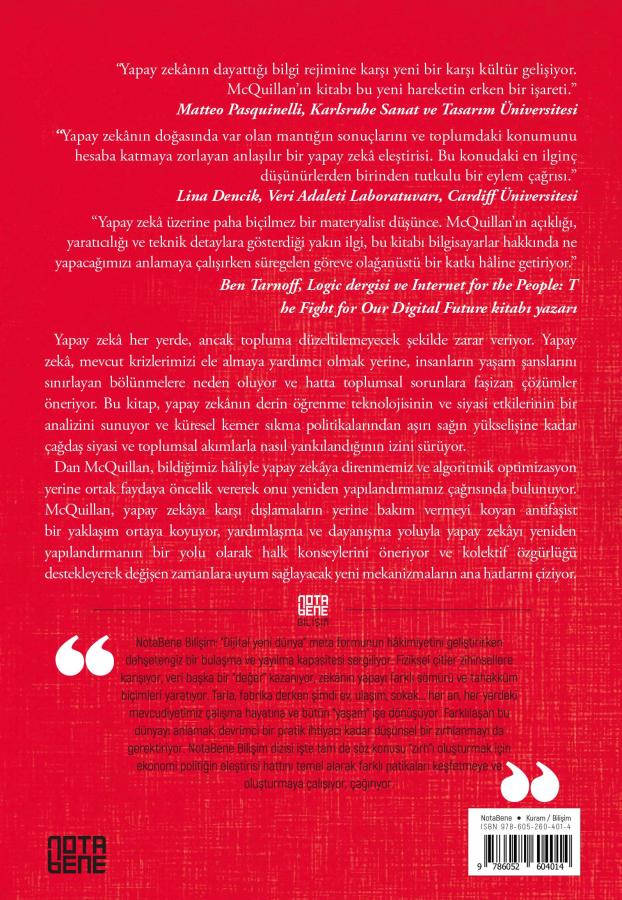 “Yapay zekâ üzerine paha biçilmez bir materyalist düşünce. McQuillan’ın açıklığı, yaratıcılığı ve teknik detaylara gösterdiği yakın ilgi, bu kitabı bilgisayarlar hakkında ne yapacağımızı anlamaya çalışırken süregelen göreve olağanüstü bir katkı hâline getiriyor.” -Ben Tarnoff, Logic dergisi ve Internet for the People: The Fight for Our Digital Future kitabı yazarı