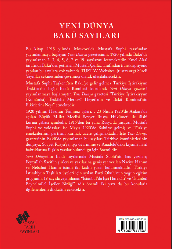 Bu kitap,1918 yılında Moskova'da Mustafa Suphi tarafından yayımlanmaya başlayan Yeni Dünya Gazetesi'nin,1920 yılında Bakü'de yayımlanan 2,3,4,5,6,7 ve 19.sayılarını içermektedir.Bu sayılar Emel Akal tarafından Bakü'den getirilmiş ve Mustafa Çulfaz tarafından transkripsiyonu yapılmıştır.Bu sayılarda,Türkiye komünist hareketinin dünya ve SSCB'ye,işçi-köylü devrimine ve Anadolu hareketine bakış açılarını içeren yazılar bulunduğu için çok önemlidir.